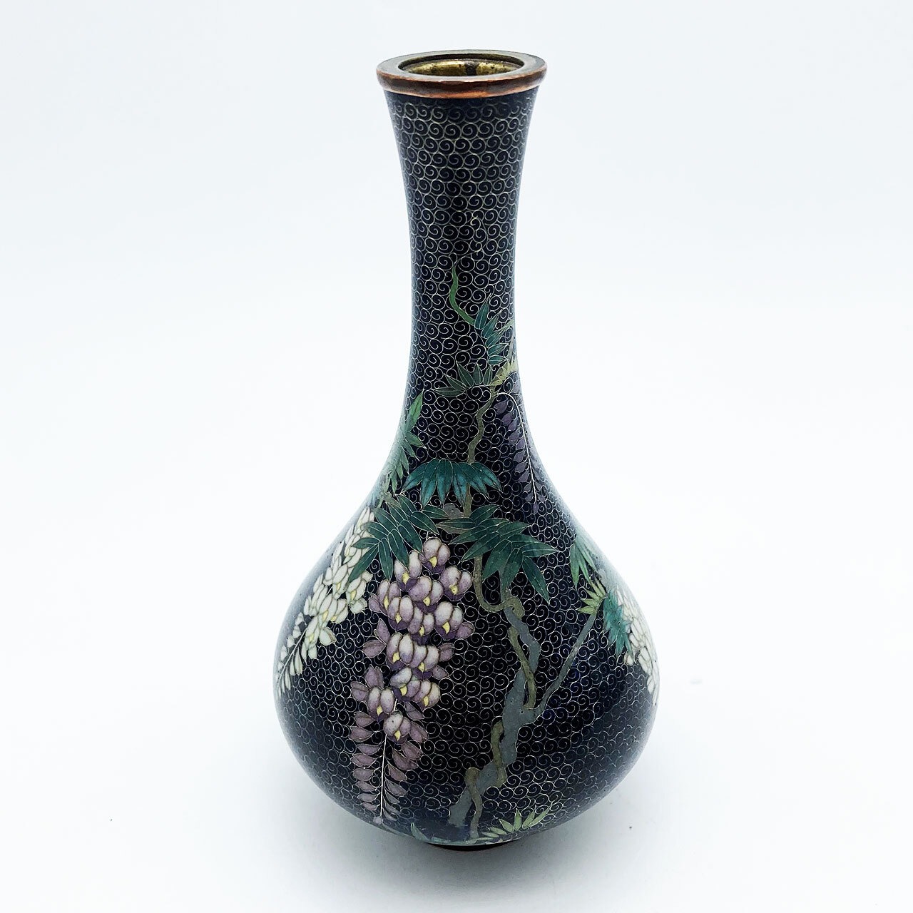 七宝焼 尾張七宝 花瓶 茄子紺地 渦巻き紋様 藤の図 明治期 時代物 13.0cm