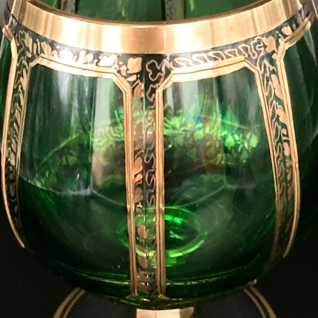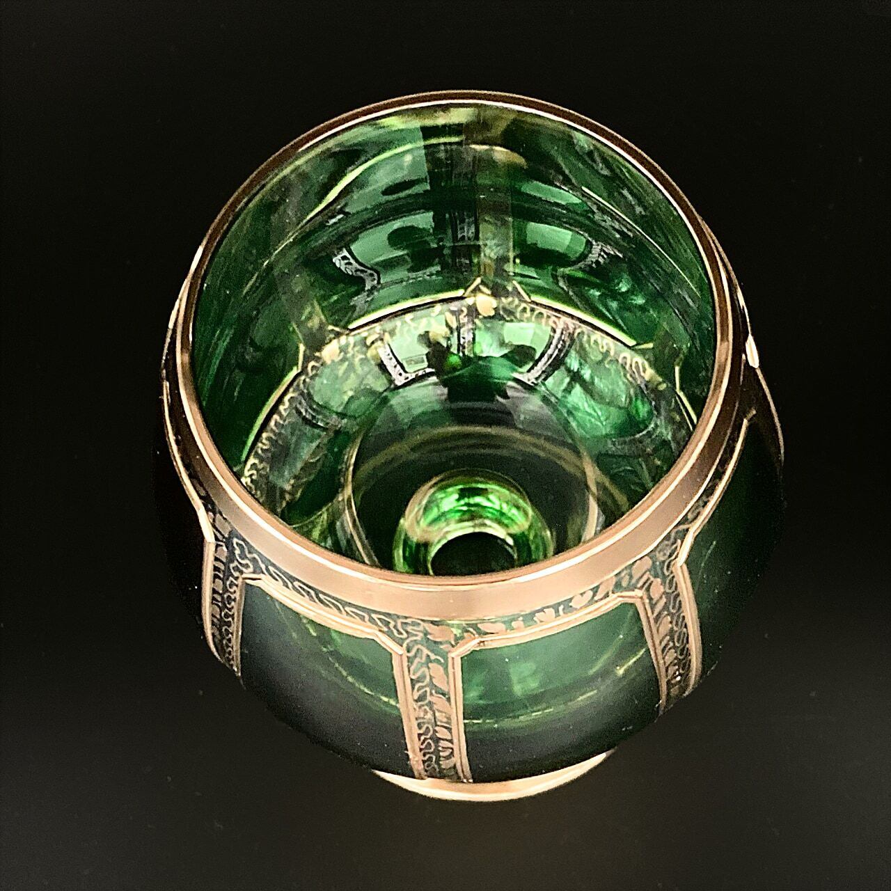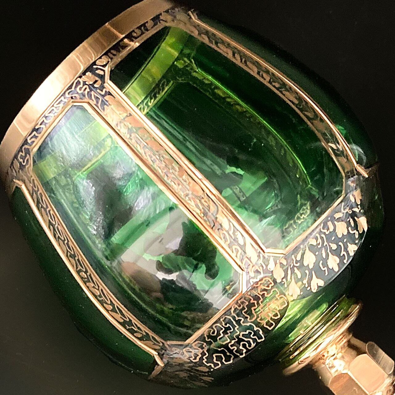 芸術性の高い繊細なカットと、美しく淡く色付けされたグリーン、金彩による丁寧な唐草模様が、王朝時代を思わせ、ボヘミアガラス独特の世界観を表現しています。