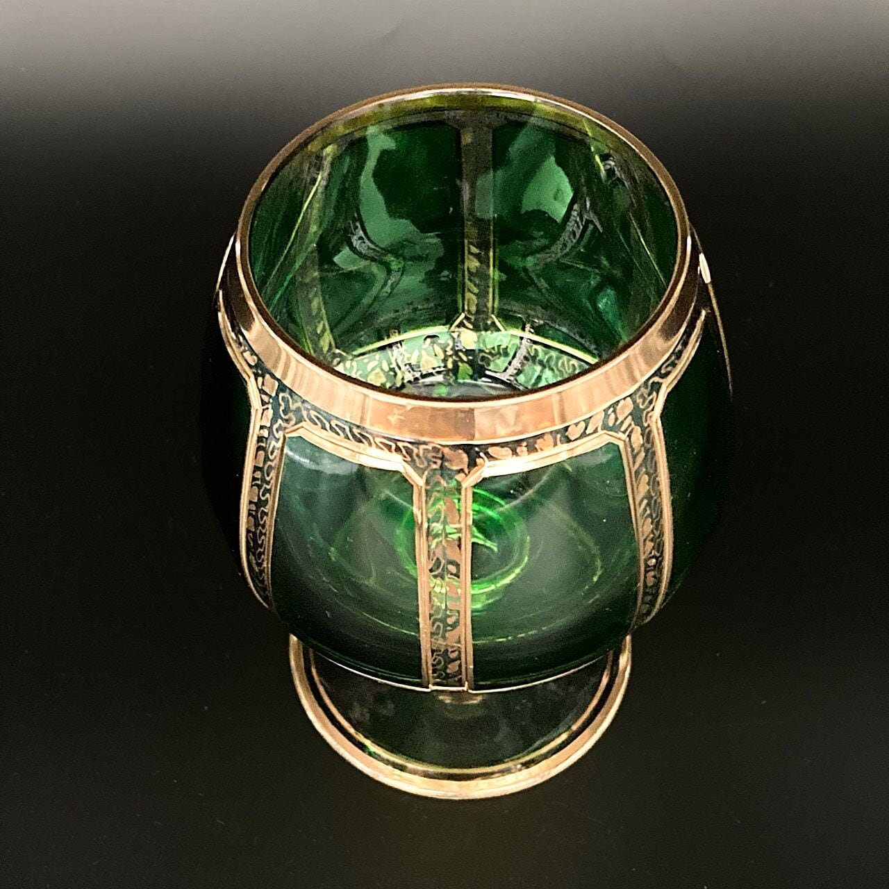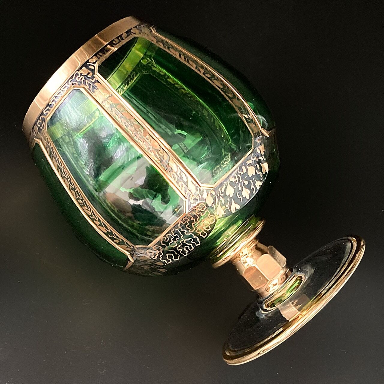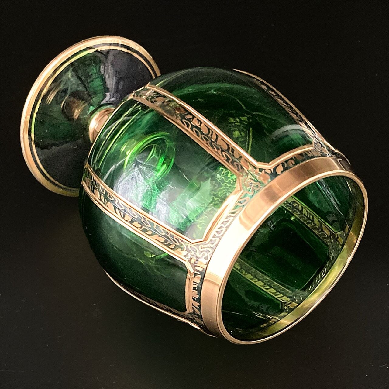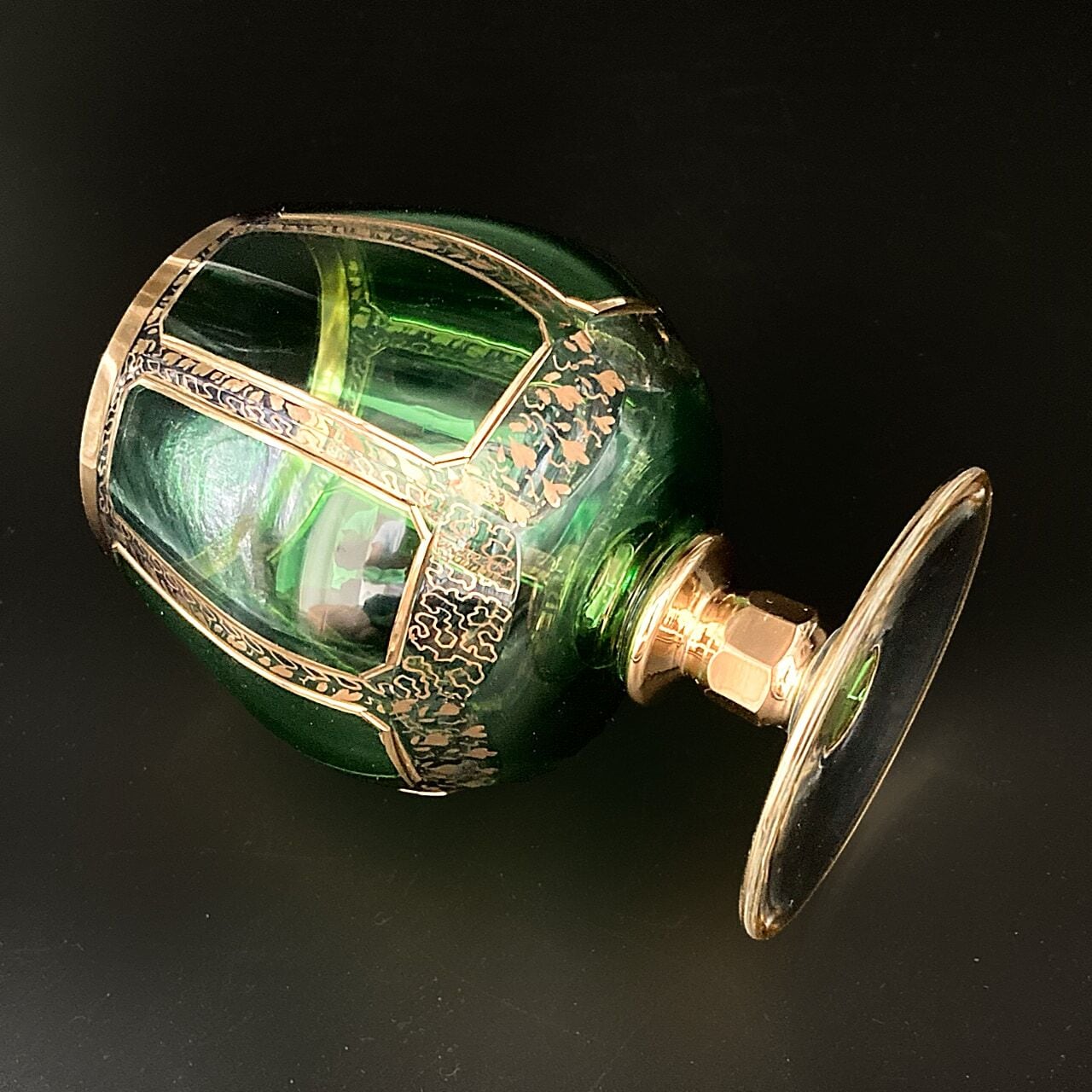 芸術性の高い繊細なカットと、美しく淡く色付けされたグリーン、金彩による丁寧な唐草模様が、王朝時代を思わせ、ボヘミアガラス独特の世界観を表現しています。